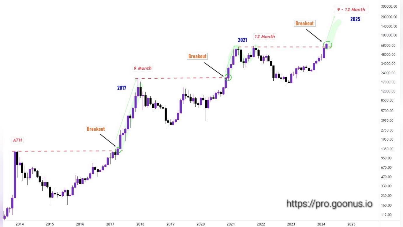 Nhà phân tích chỉ ra các chu kỳ lịch sử, cụ thể là năm 2017 và 2021. Trong cả hai trường hợp, Bitcoin đều có mức tăng mạnh sau khi vượt qua mức cao nhất mọi thời đại. Bitcoin đạt đến đỉnh chu kỳ sau đó 9 đến 12 tháng.