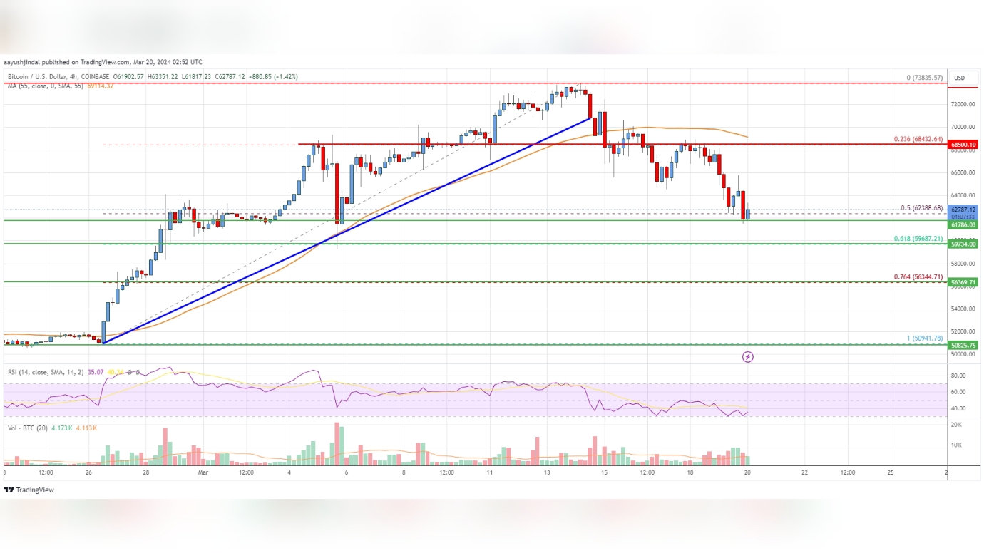 • Bitcoin đã giảm xuống dưới 65.000$ sau khi đạt mức cao nhất mọi thời đại gần 74.000 đô la.