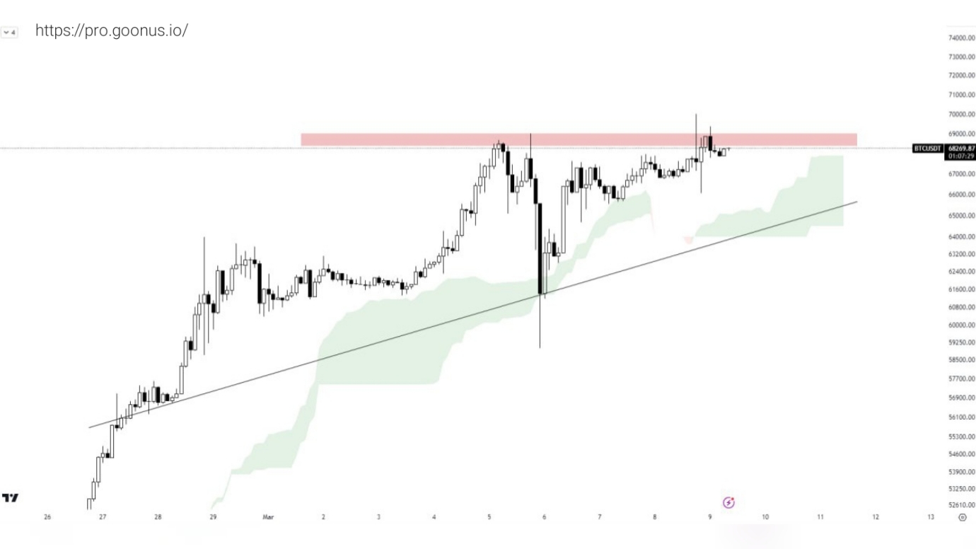 hiện tại BTC đang di chuyển trong một tam giác tăng dần. Đám mây Ichimoku cho thấy xu hướng tăng, Chờ đợi một đột phá vững chắc của tam giác sẽ xác nhận đà tăng tiếp theo của BTC.