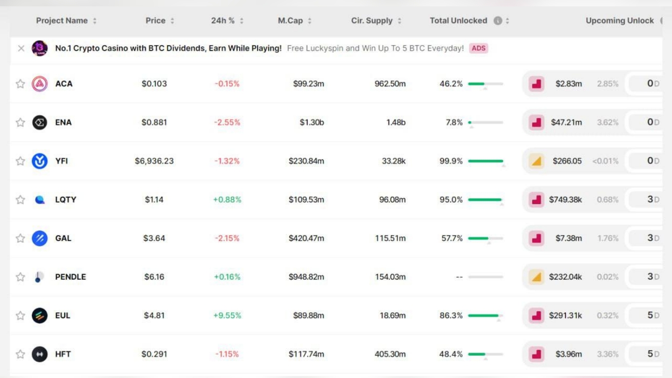Ngoài ra, còn có các token Unlock khác như: $YFI, $PENDLE, $EUL,…Ae