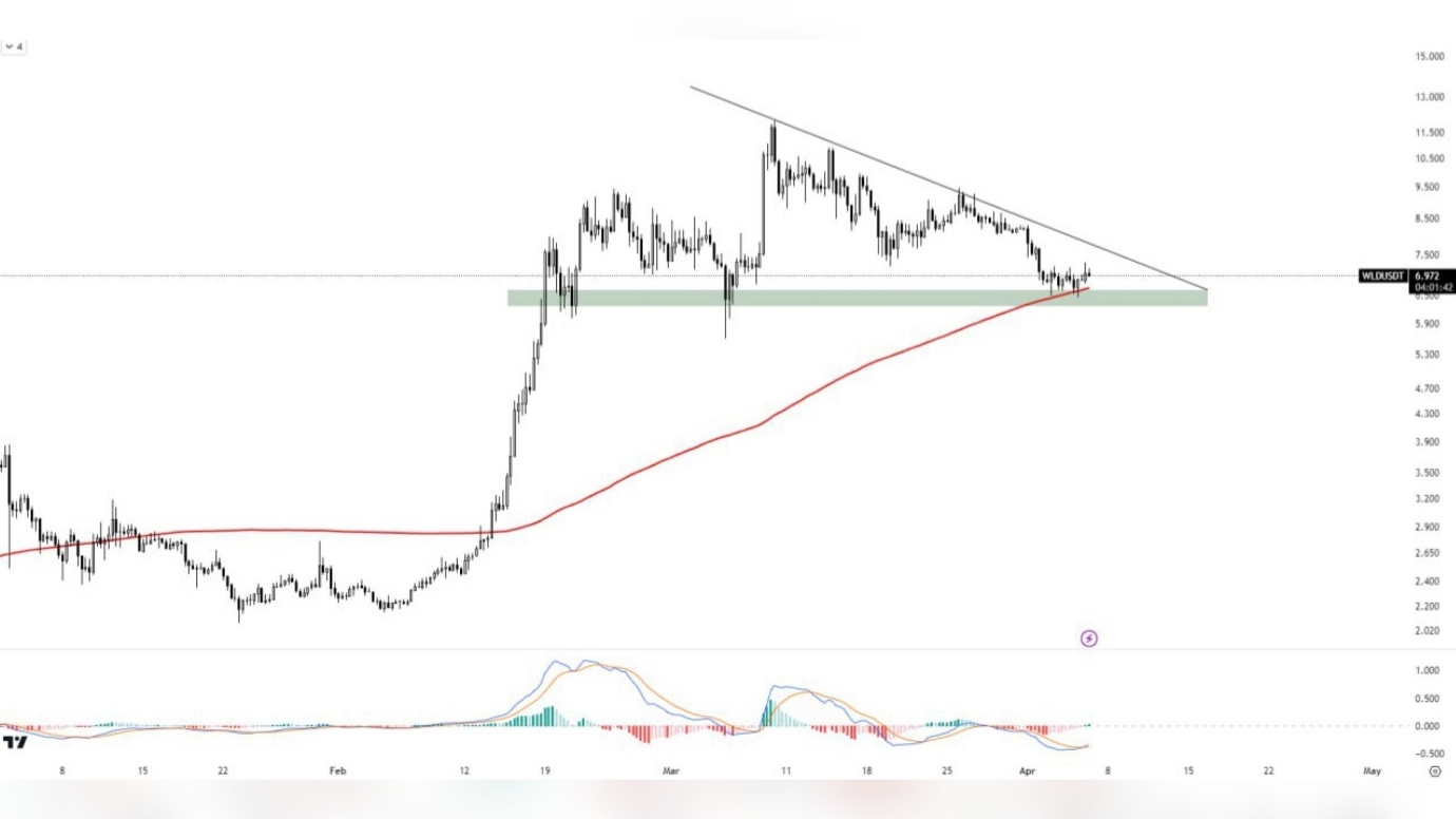 • WLD đang trong mô hình tam giác giảm dần, nhưng vẫn giữ được mức hỗ trợ ngang và MA 200. Sự giao nhau của MACD đang chuyển sang xu hướng tăng, khối lượng tăng tốt. Sự bứt phá của tam giác sẽ là sự xác nhận xu hướng tăng giá, trong khi sự phá vỡ kéo dài sẽ là sự xác nhận xu hướng giảm giá.