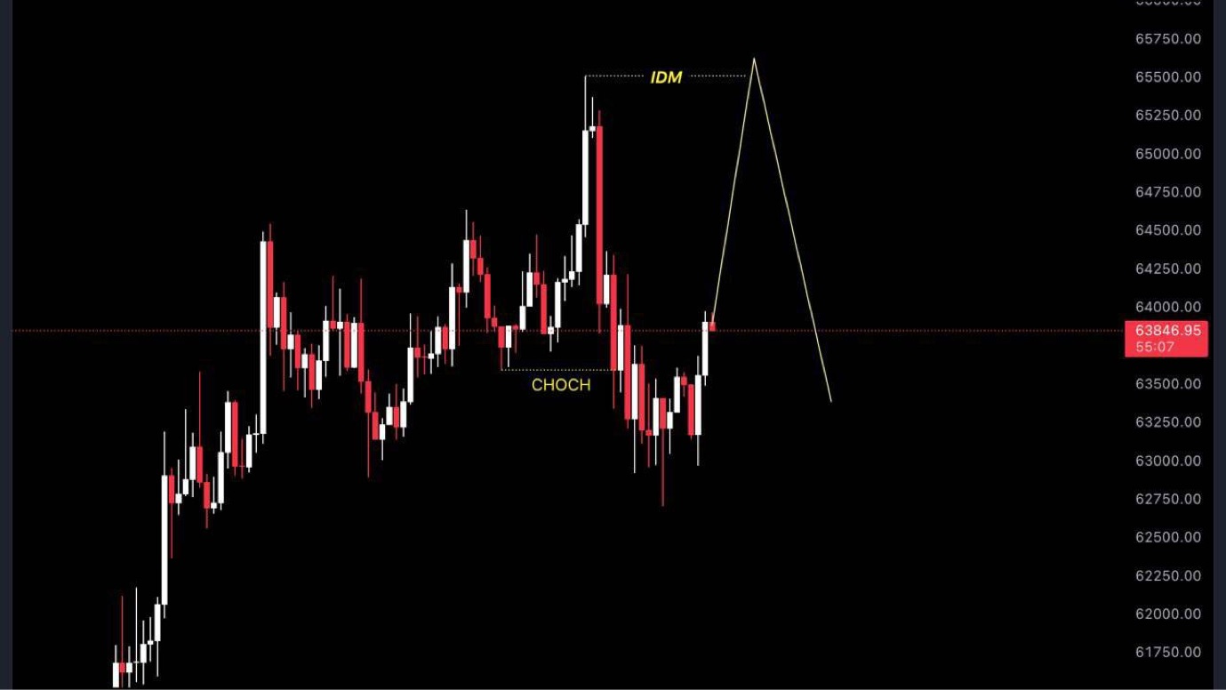 Đồ thị nến h1 đã tạo Choch xác nhận tiếp diễn xu hướng giảm chúng ta đợi sweep lấy IDM tại vùng 65k6 lúc đấy có tín hiệu đẹp có thể mở vị thế Short xuống