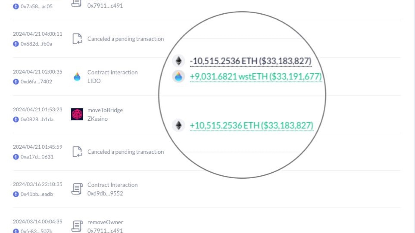 Ngày 21.04 vừa qua họ đã chuyển 10.515 $ETH ($33M) từ phía người dùng gửi vào ZKasino sang một địa chỉ ví đa chữ ký (multisig: safe).