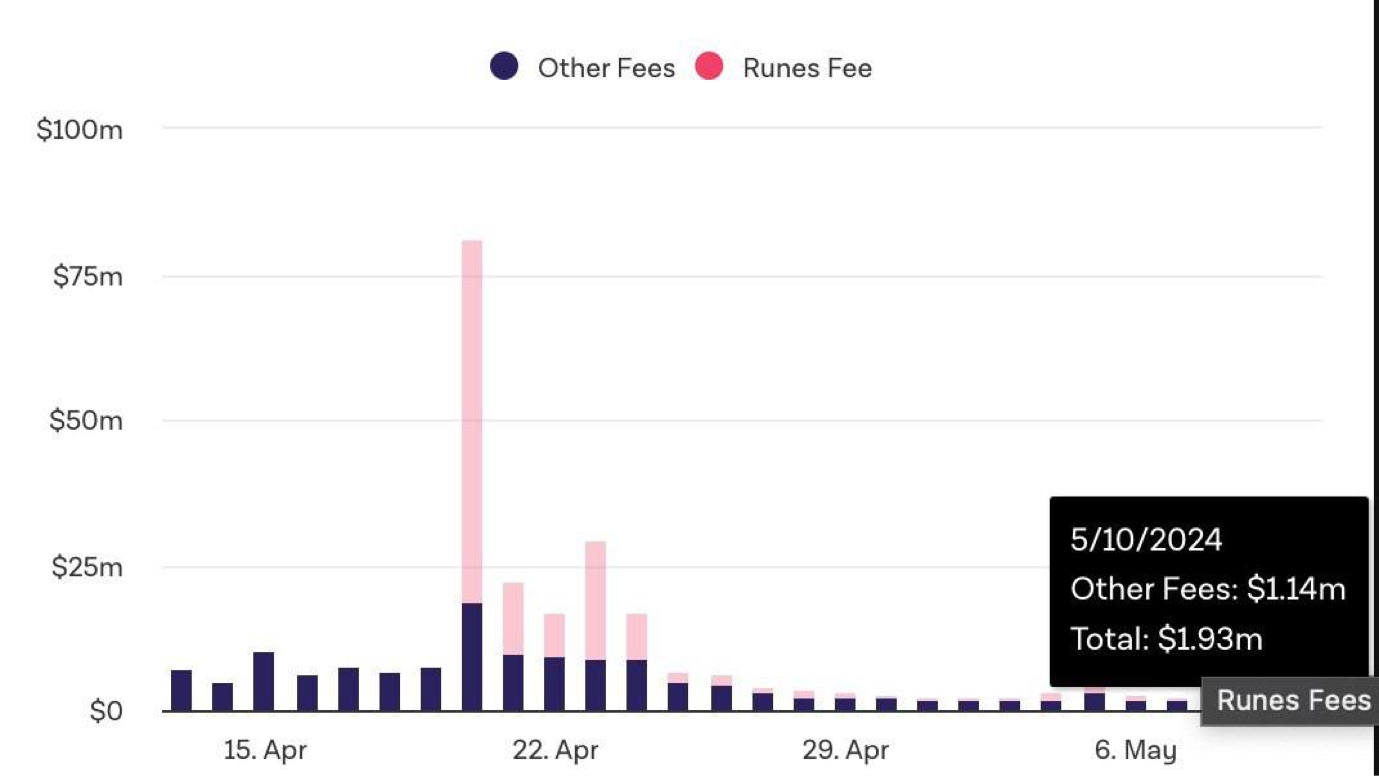 Giao thức Runes, được ra mắt trên Bitcoin ba tuần trước sau sự kiện Halving, đã tạo ra 135 triệu đô la phí trong tuần đầu tiên, nhưng hoạt động kể từ đó đã giảm đáng kể.