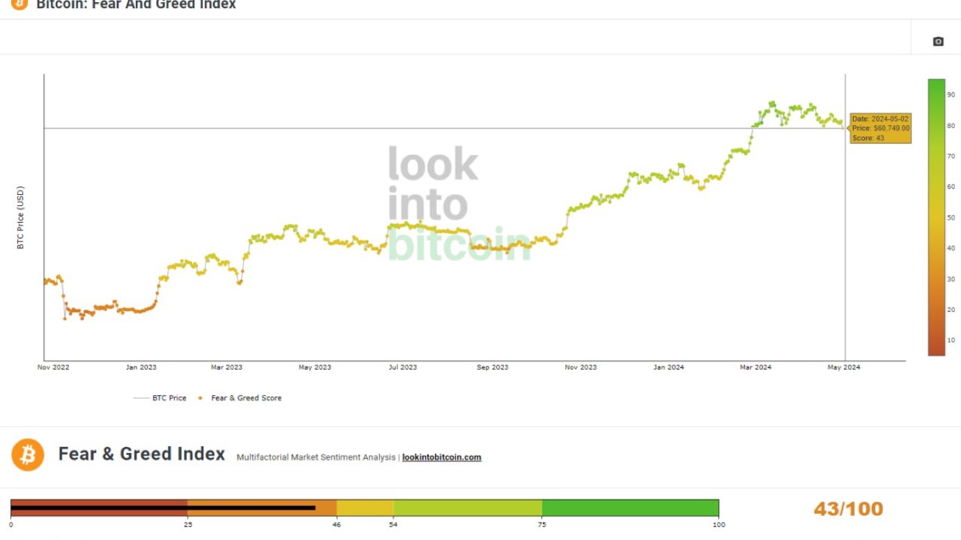 Bitcoin Fear and Greed Index trong suốt 8 tháng qua(kể từ tháng 9/2023) lần đầu tiên giảm mạnh về 43 điểm. Đã 8 tháng rồi, tâm lý thị trường mới rơi vào sợ hãi “Fear” trở lại. Trong 8 tháng qua, tuyệt nhiên tâm lý thị trường luôn luôn lạc quan.