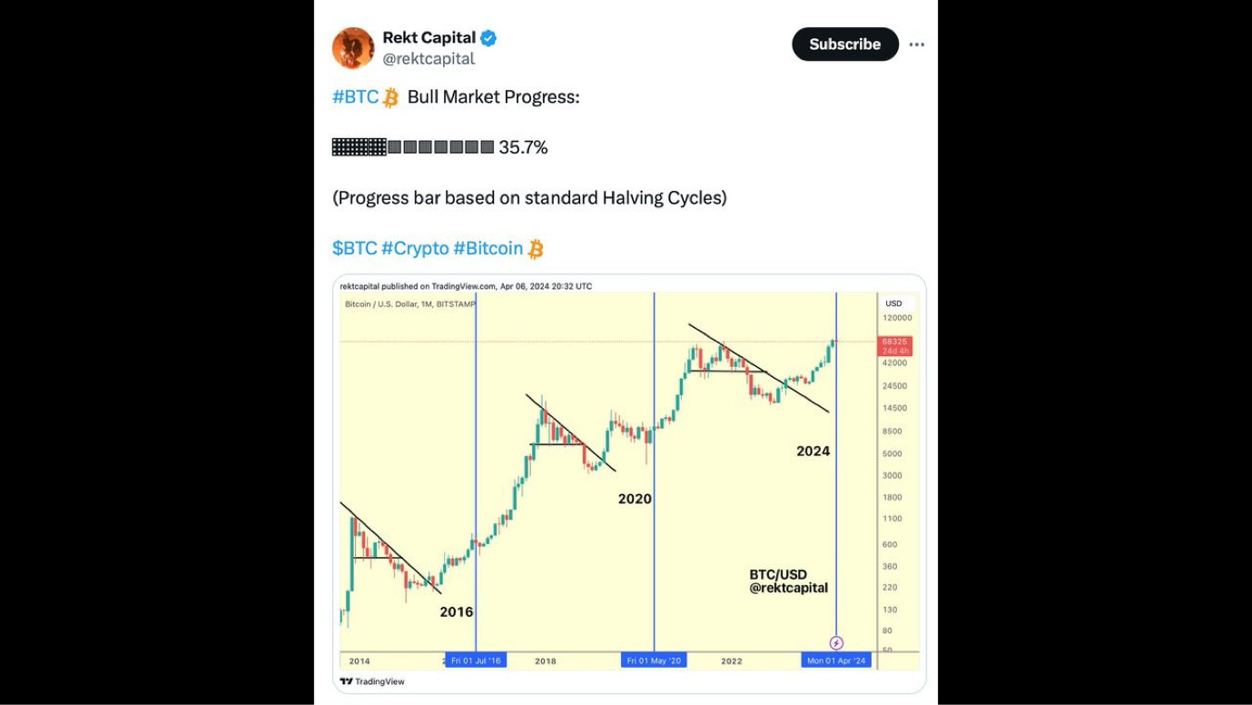 Trong bài đăng ngày 07/04, nhà giao dịch crypto Rekt Capital nói với 443.000 người theo dõi của mình rằng thị trường đang ở khoảng một phần ba của giai đoạn “thị trường tăng giá” (bull run market).