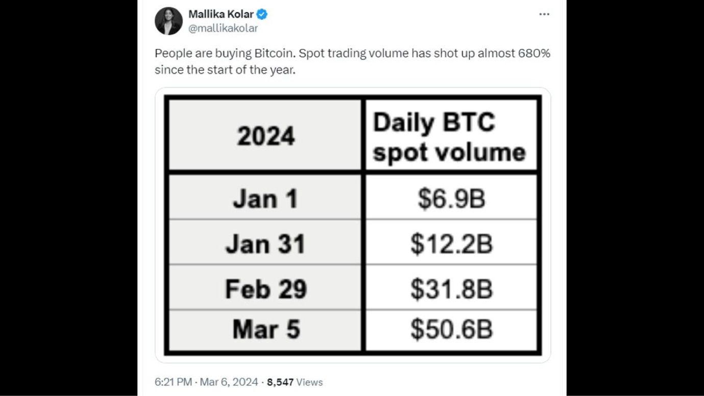 Khối lượng giao dịch spot Bitcoin trên các sàn giao dịch tập trung đã đạt mức cao nhất trong 12 tháng qua vào ngày 5 tháng 3, với tổng khối lượng giao dịch hàng ngày là 46,26 tỷ USD. Con số này cho thấy sự gia nhập trở lại của các nhà đầu tư cá nhân.