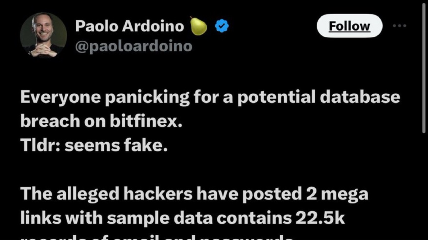 Paolo Ardoino: Vụ việc hack cơ sở dữ liệu tại Bitfinex có vẻ không có cơ sở. Dữ liệu mà hacker chia sẻ chỉ có ít điểm trùng khớp với người dùng Bitfinex, và công ty không lưu trữ mật khẩu dưới dạng văn bản thuần. Bitfinex nghi ngờ rằng dữ liệu này đến từ các vụ việc bị hack tiền điện tử trước đây, do việc tái sử dụng thông tin đăng nhập là phổ biến. Không có bất kỳ dấu hiệu xâm nhập hệ thống nào được phát hiện trong hệ thống của họ, và họ xác nhận rằng tất cả các tiền đều an toàn. Tình hình vẫn đang được theo dõi chặt chẽ.