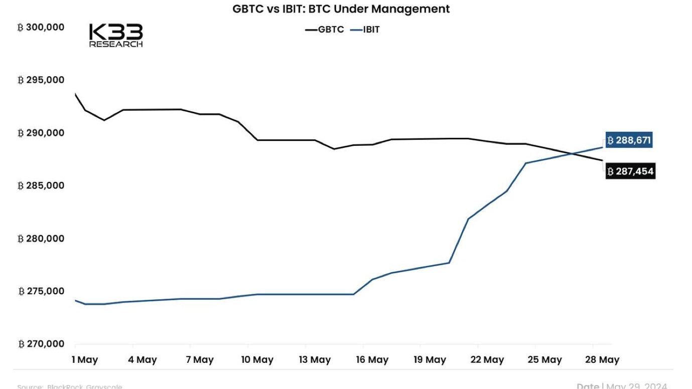 BlackRock IBIT chính thức vượt mặt Grayscale GBTC để trở thành quỹ ETF Bitcoin Spot lớn nhất thế giới, nắm giữ 288,671 BTC ~ gần 20 tỷ USD.