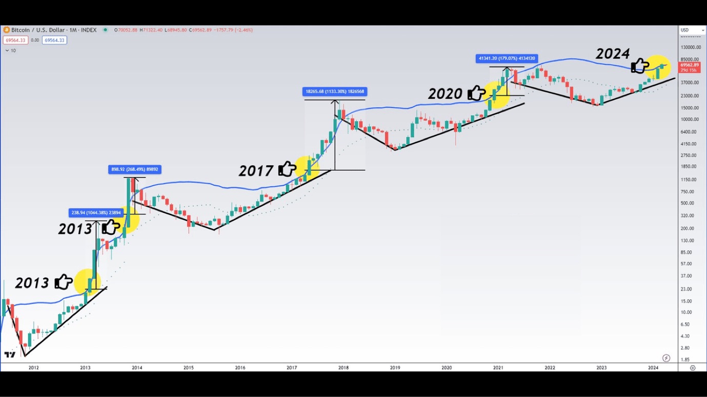 Giá Bitcoin lập ATH (73.734 USD) vào tháng 3, trước halving khoảng 1 tháng.