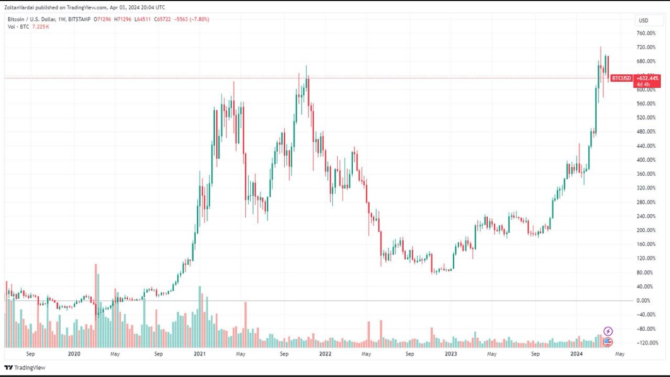 Theo dữ liệu từ TradingView, giá Bitcoin (BTC) đã tăng khoảng 658% kể từ lần halving Bitcoin cuối cùng vào năm 2020 và hiện đang giao dịch quanh mức 66.000 USD