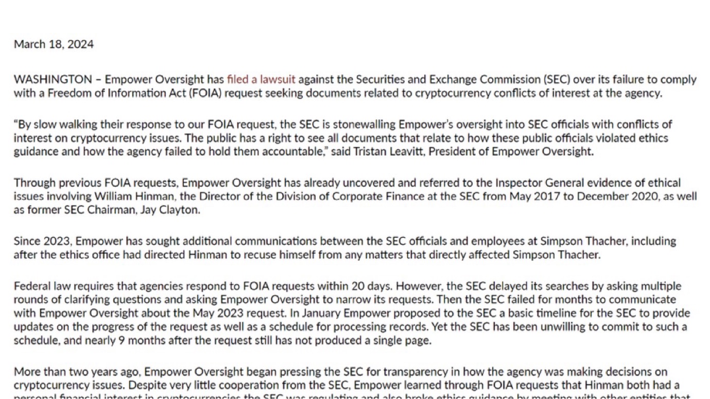 Empower Oversight đã đệ đơn kiện SEC vì SEC đã không giao nộp các tài liệu về lý do Cựu Giám Đốc Hinman và Cựu Chủ Tịch SEC Jay Clayton tuyên bố rằng ETH không phải là chứng khoán, dựa trên luật tự do thông tin của Hoa Kỳ 🇺🇸