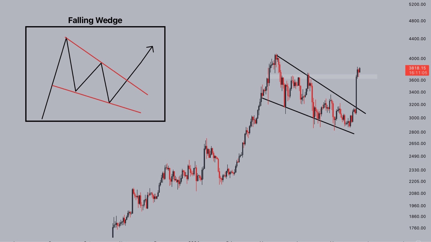 Nhà phân tích Jelly cũng có cùng quan điểm tích cực như QCP, khi ông chỉ ra việc ETH đã phá mô hình cái nêm giảm (falling wedge) trên khung ngày, sẵn sàng tích lũy để vượt mốc 6.000 USD trong năm nay.