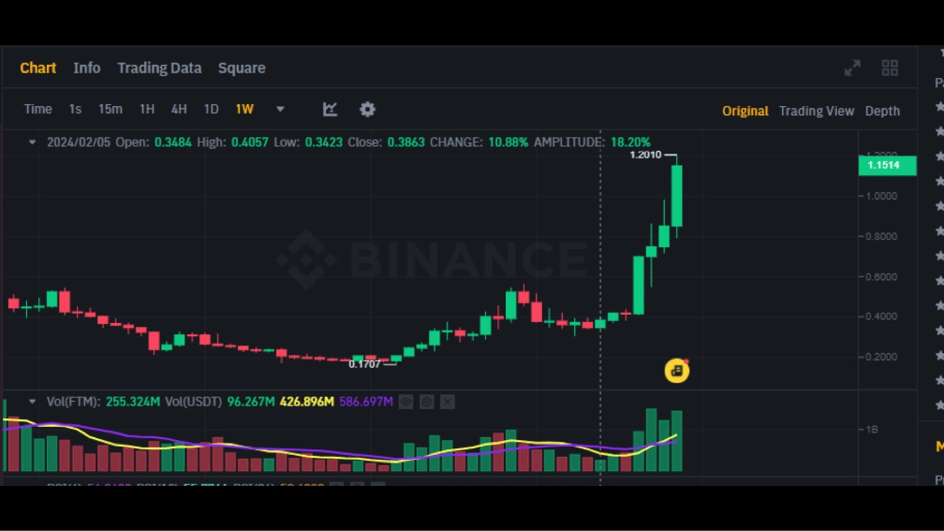Theo dữ liệu được CoinGecko theo dõi, giá của FTM đã tăng vọt từ $0,4 lên $1,16, đạt mức cao nhất kể từ tháng 4 năm 2022. Vốn hóa thị trường của FTM đã nhảy vọt lên 3,29 tỷ USD, trở thành tài sản kỹ thuật số lớn thứ 44 trên thế giới.
