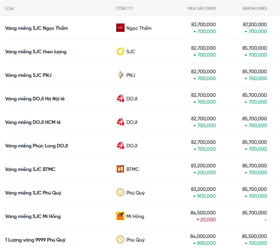 Giá bán ra cao nhất được ghi nhận tại vàng miếng SJC Mi Hồng với mức 85,700,000 VND/lượng, trong khi giá thấp nhất thuộc về SJC và PNJ với mức 85,000,000 VND/lượng (bán ra). Biến động trong 24 giờ qua chủ yếu tăng 700,000 VND, tương đương khoảng +0.82% đối với các loại vàng miếng.