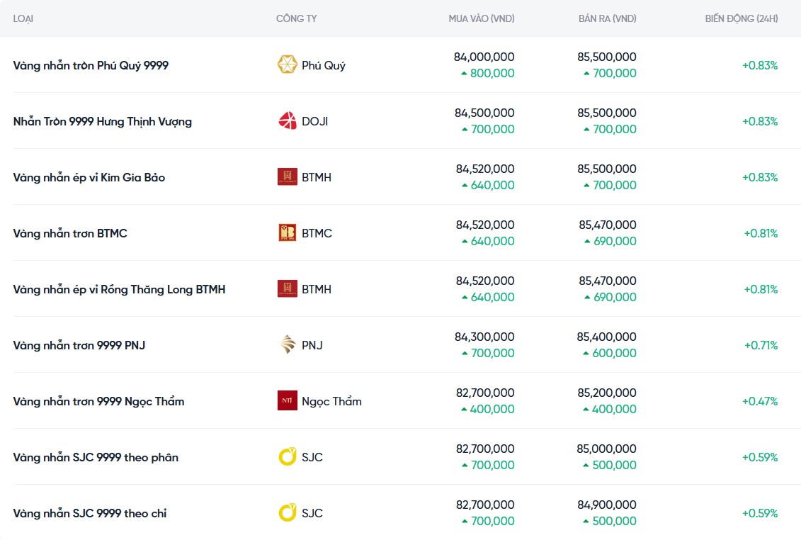 Giá vàng nhẫn tròn Phú Quý 9999 dẫn đầu với mức bán ra 85,500,000 VND/chỉ, tăng 700,000 VND (+0.83%). Giá thấp nhất được ghi nhận tại vàng nhẫn tròn Ngọc Thẩm với mức 85,200,000 VND/chỉ, tăng 400,000 VND (+0.47%). Biến động giá trong 24 giờ qua dao động từ +0.47% đến +0.83%.