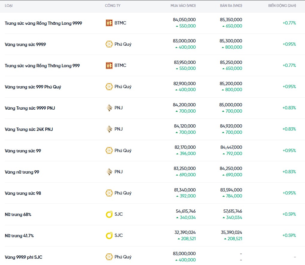 Giá cao nhất thuộc về vàng trang sức Rồng Thăng Long 9999 của Bảo Tín Minh Châu với mức bán ra 85,350,000 VND/chỉ, tăng 650,000 VND (+0.77%). Giá thấp nhất ghi nhận ở nữ trang 41.7% của SJC với mức bán ra 35,390,024 VND/chỉ, tăng 208,521 VND (+0.59%). Biến động giá trong 24 giờ chủ yếu từ +0.59% đến +0.95%.