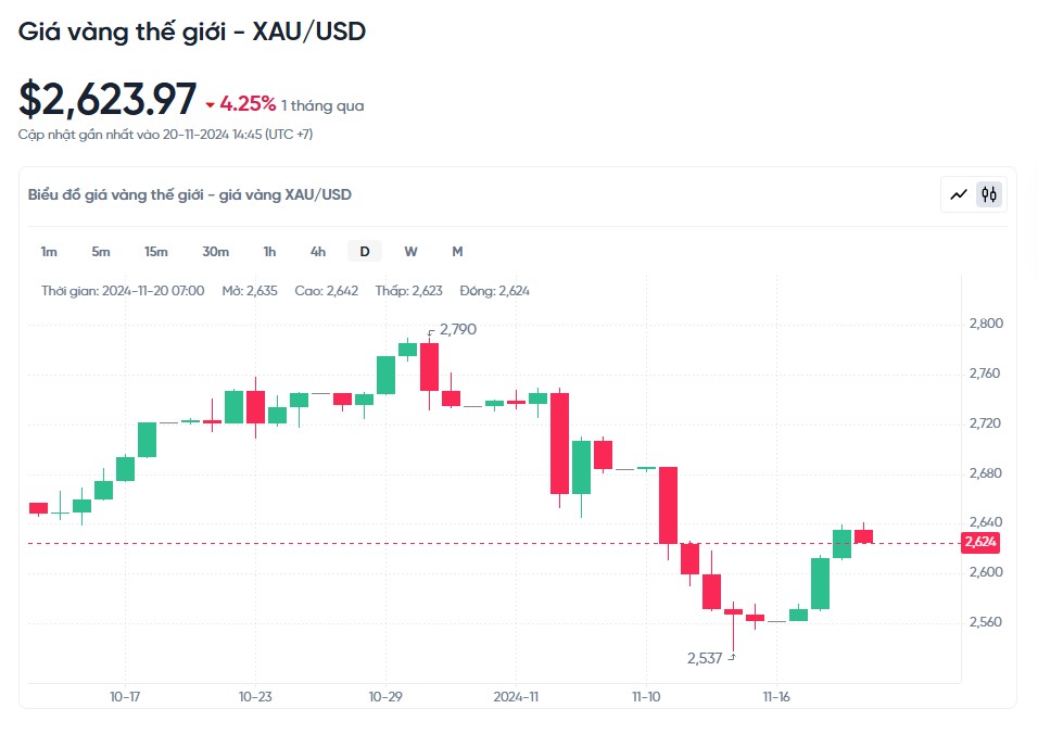 Vào lúc 14:45 chiều nay, giá vàng thế giới giao ngay được ghi nhận ở mức 2,624 USD/ounce, giảm 16 USD/ounce so với phiên sáng. Hiện tại, mức giá này vẫn nằm trong vùng hỗ trợ, cho thấy khả năng giá vàng có thể phục hồi trở lại. Tuy nhiên, nếu giá giảm xuống dưới ngưỡng 2,615 USD, xu hướng tăng có nguy cơ bị phá vỡ.