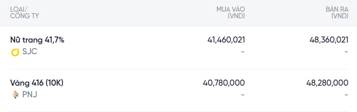 Vàng 416 (10k) của PNJ niêm yết Giá vàng 10K với mức mua vào là 40,780,000 VND và bán ra là 48,280,000 VND. Trong khi đó, nữ trang 41,7% của SJC có giá mua vào 41,460,021 VND và bán ra 48,360,021 VND.