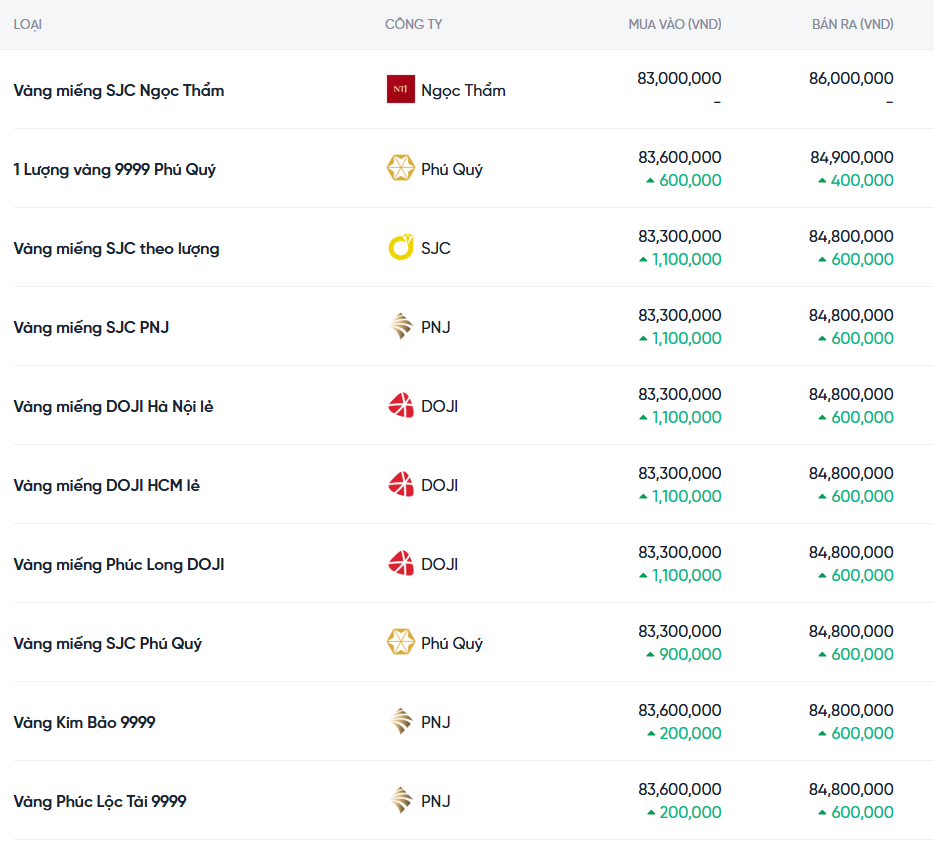 Giá vàng miếng hôm nay tăng mạnh tại nhiều thương hiệu lớn. Vàng miếng SJC tại PNJ tăng 1.100.000 VNĐ ở chiều mua vào ở mức 83.300.000 VNĐ. Vàng miếng Phú Quý tăng thêm 600.000 VNĐ chiều bán ra, đạt 84.800.000 VNĐ, trong khi DOJI ghi nhận mức tăng 600.000 VNĐ chiều bán ra, đạt mức 84.800.000 VNĐ/ lượng.
