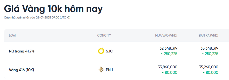 Nhóm vàng 10K hôm nay tăng nhẹ. Tại SJC, giá mua vào đạt 32,348,319 VND/lượng và bán ra 35,348,319 VND/lượng, tăng 250,225 VND ở cả hai chiều. Trong khi đó, tại PNJ, giá mua vào đạt 33,860,000 VND/lượng và bán ra 35,260,000 VND/lượng, tăng 80,000 VND ở cả hai chiều.