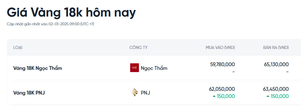 Giá vàng 18K hôm nay tiếp tục ghi nhận biến động nhẹ. Tại Ngọc Thẩm, giá mua vào ở mức 59,780,000 VND/lượng và bán ra ở mức 65,130,000 VND/lượng, không thay đổi so với ngày trước. Trong khi đó, tại PNJ, giá mua vào đạt 62,050,000 VND/lượng và bán ra 63,450,000 VND/lượng, tăng 150,000 VND ở cả hai chiều.