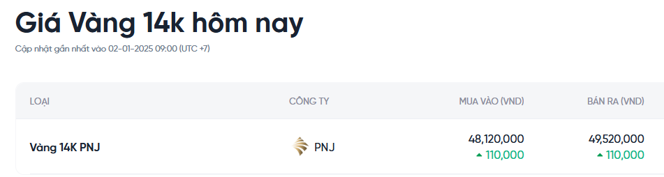 Giá vàng 14K PNJ hôm nay cũng ghi nhận mức tăng nhẹ. Giá mua vào đạt 48,120,000 VND/lượng và bán ra 49,520,000 VND/lượng, tăng 110,000 VND ở cả hai chiều, tiếp tục duy trì xu hướng ổn định trong các giao dịch gần đây.