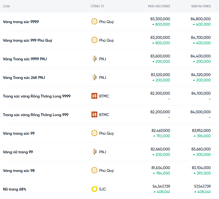 Giá vàng trang sức hôm nay ghi nhận sự tăng nhẹ. Vàng trang sức 9999 của Phú Quý tăng 800.000 VNĐ ở chiều mua vào, đạt 83.300.000 VNĐ. Giá bán ra tăng 400.000 VNĐ đẩy giá lên mức 84.800.000 VNĐ. Vàng trang sức 9999 tại PNJ cũng tăng 200.000 VNĐ, giữ giá bán ra ở mức 84.400.000 VNĐ.