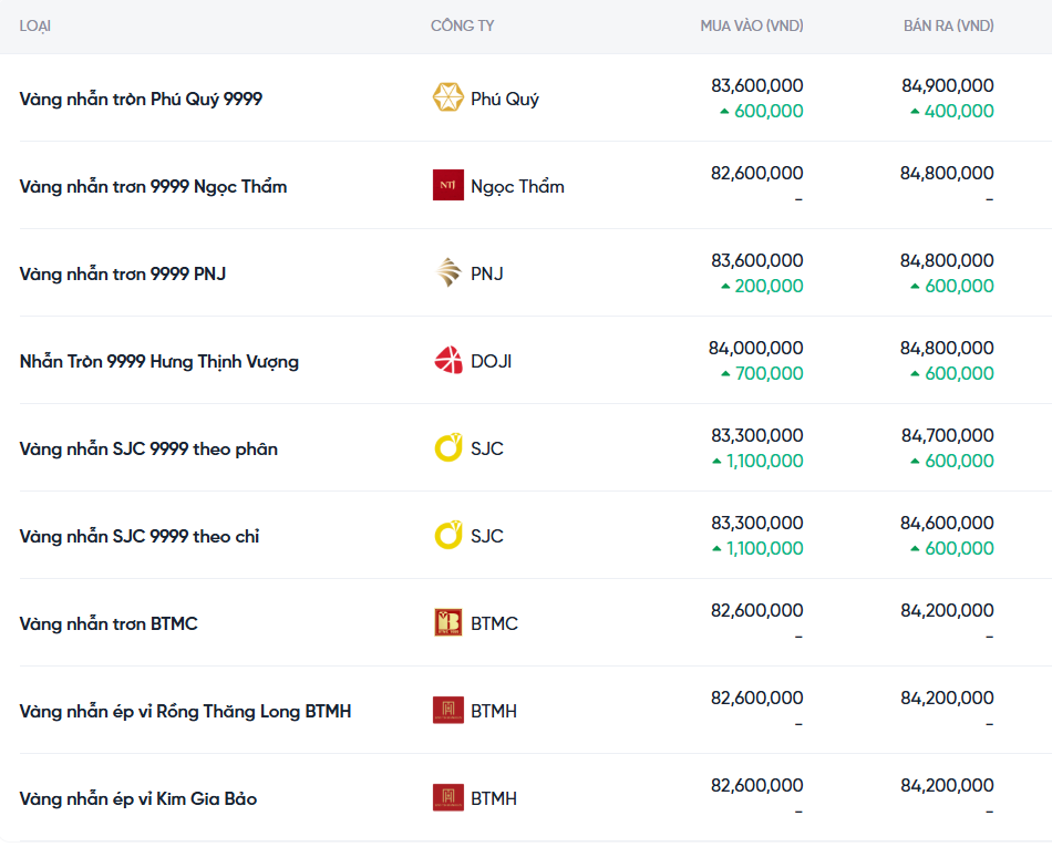 Giá vàng nhẫn tiếp tục tăng giá đáng kể. Vàng nhẫn tròn 9999 của SJC tăng 600.000 VNĐ ở cả hai chiều, đưa giá bán ra lên 84.700.000 VNĐ. Vàng nhẫn tròn Phú Quý tăng 600.000 VNĐ, đạt mức giá bán ra 84.900.000 VNĐ. Đáng chú ý, vàng nhẫn tròn Hưng Thịnh Vượng của DOJI tăng 700.000 VNĐ chiều mua vào, giữ mức giá bán ra ở 84.800.000 VNĐ/ lượng.