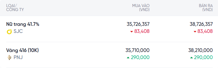 Giá vàng 10K hôm nay tiếp tục biến động mạnh. Sản phẩm nữ trang 41. 7% của SJC ghi nhận mức giảm mạnh 83,408 VND ở cả hai chiều, với giá mua vào 35,726,357 VND và bán ra 38,726,357 VND. Trong khi đó, vàng 416 (10k) của PNJ đã tăng mạnh 290,000 VND, hiện được mua vào với giá 35,710,000 VND và bán ra 38,210,000 VND.
