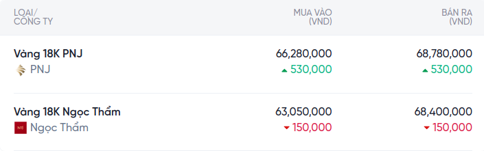 Giá vàng 18K có xu hướng biến động mạnh tại cả PNJ và ngọc thẫm. Tại PNJ, giá mua vào là 66,280,000 VND và bán ra 68,780,000 VND, đều tăng mạnh với mức 530,000 VND. Ngọc thẫm ghi nhận mức giảm 150,000 VND, với giá mua vào 63,050,000 VND và bán ra 68,400,000 VND.
