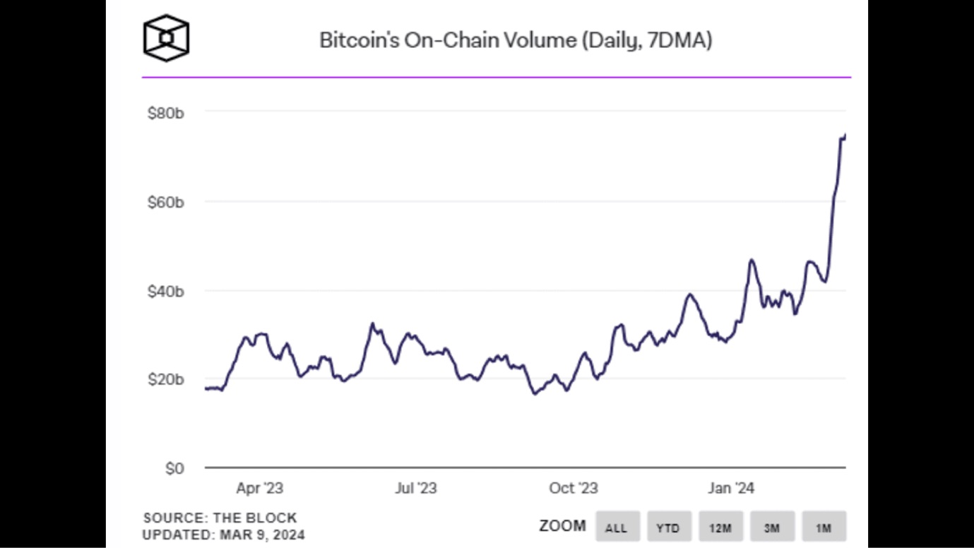 Theo dữ liệu từ The Block, trung bình cộng trong 7 ngày của khối lượng giao dịch trên mạng Bitcoin đã đạt mức cao nhất kể từ tháng 9 năm 2022, cách đây 18 tháng.