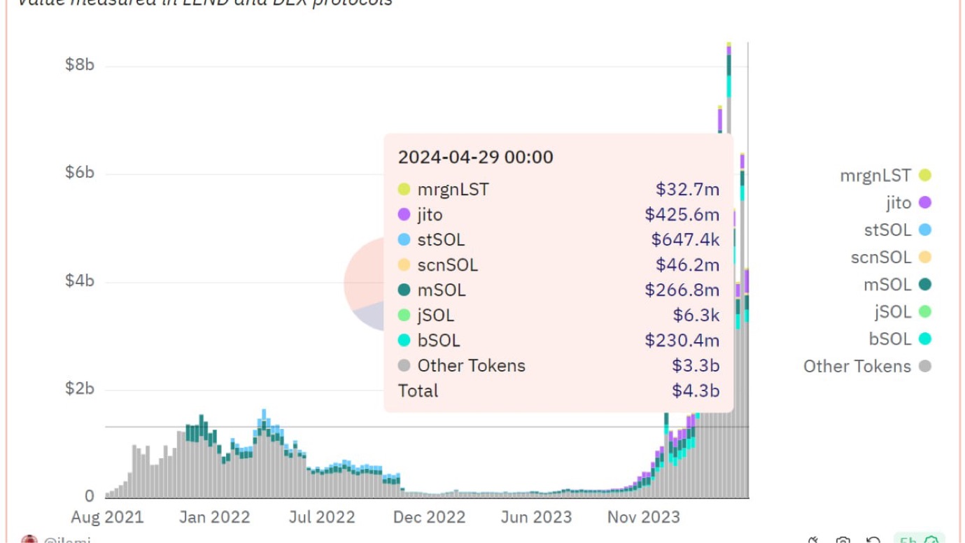 Trong đó, khoảng 40% LST JitoSOL đang được triển khai làm tài sản thế chấp trong DeFi.