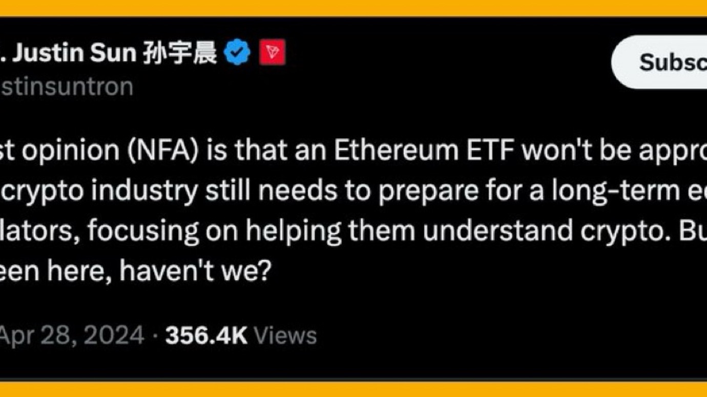 Justin Sun của Tron Ý kiến thật lòng của tôi (không phải lời khuyên tài chính) là quỹ ETF Ethereum sẽ không được phê duyệt vào tháng 5.