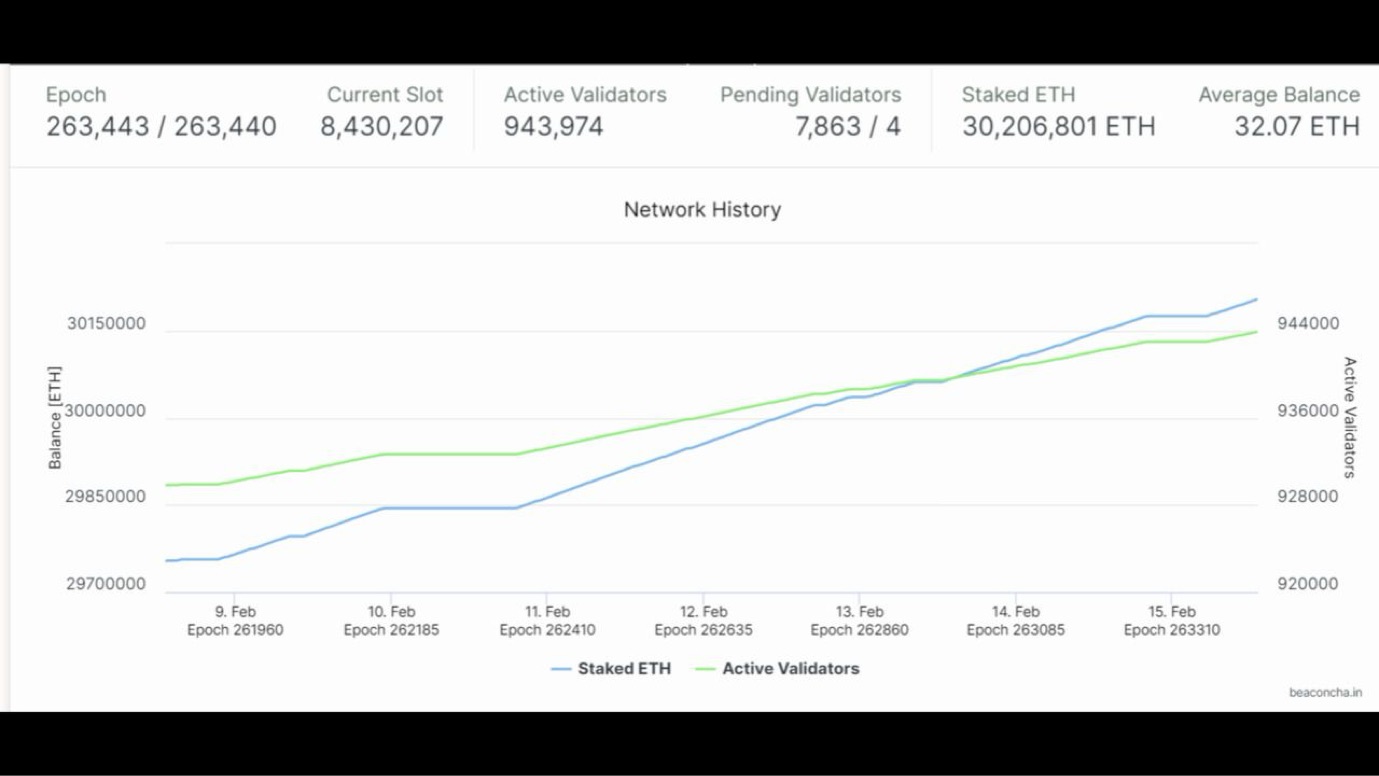Tổng số ETH được stake trong Beacon Chain đã đạt 30.206.801 ETH, trị giá hơn 85 tỷ USD, chiếm gần 25% tổng nguồn cung lưu hành. Hiện có 943.974 validators đang hoạt động trên Beacon Chain.