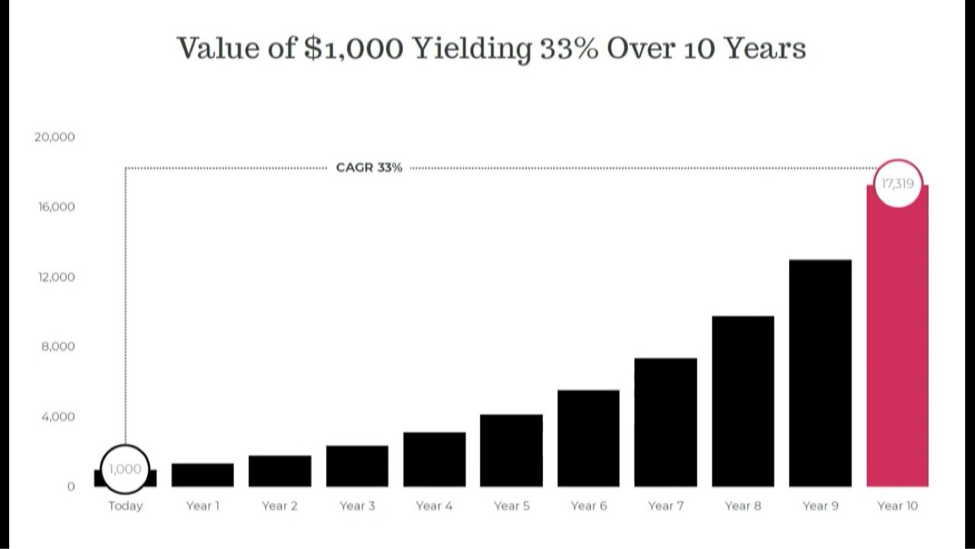 🎯 Trong 10 năm tới, Russ cho rằng ETH có thể mang lại lợi nhuận gấp 17 lần so với mức định giá hiện tại. Đề cập đến mức tăng trưởng 33% mỗi năm của Ethereum wallet/profit, Russ nói rằng việc sử dụng lãi kép đơn giản thì 1.000 USD đầu tư vào ETH ngày nay sẽ có giá trị 17.319 USD vào năm 2033.