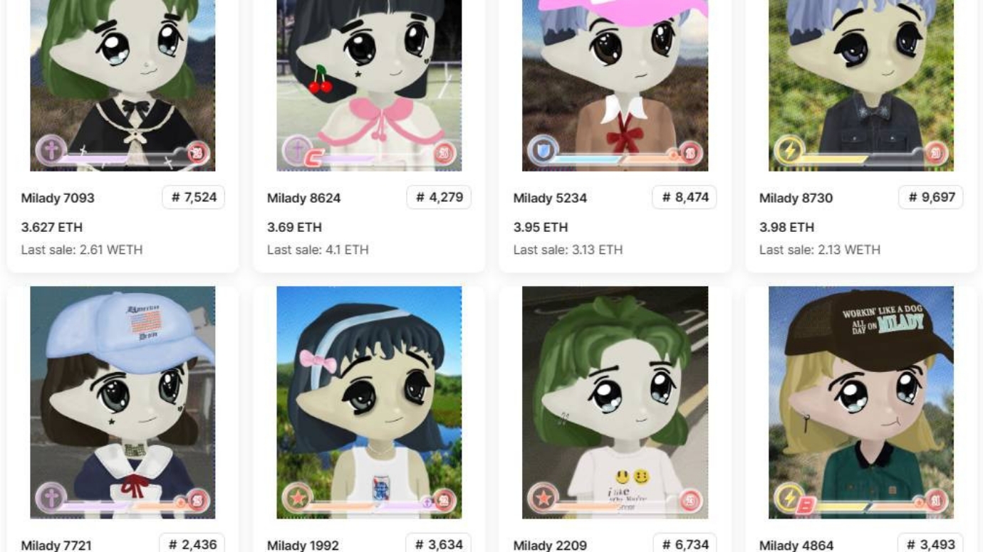 – Volume giao dịch NFT Milady đã giảm 80% trong 24h qua, còn giá sàn vẫn giữ được quanh mốc 3,6 ETH.
