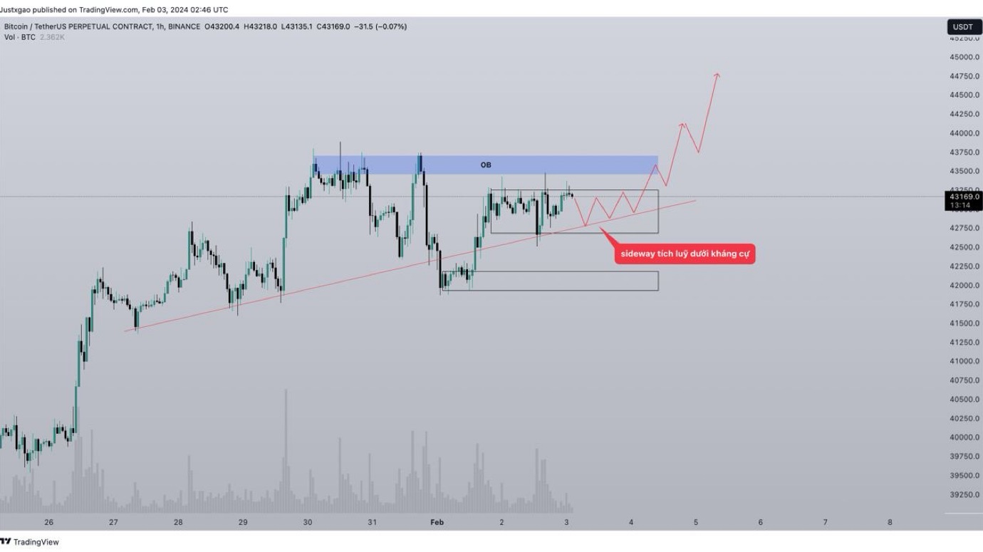 Nhìn chung Btc muốn đi lên cao hơn thì sẽ tạo thêm 1 higher high nhỏ trên 43300 thì sẽ có lực mua thêm sau đó