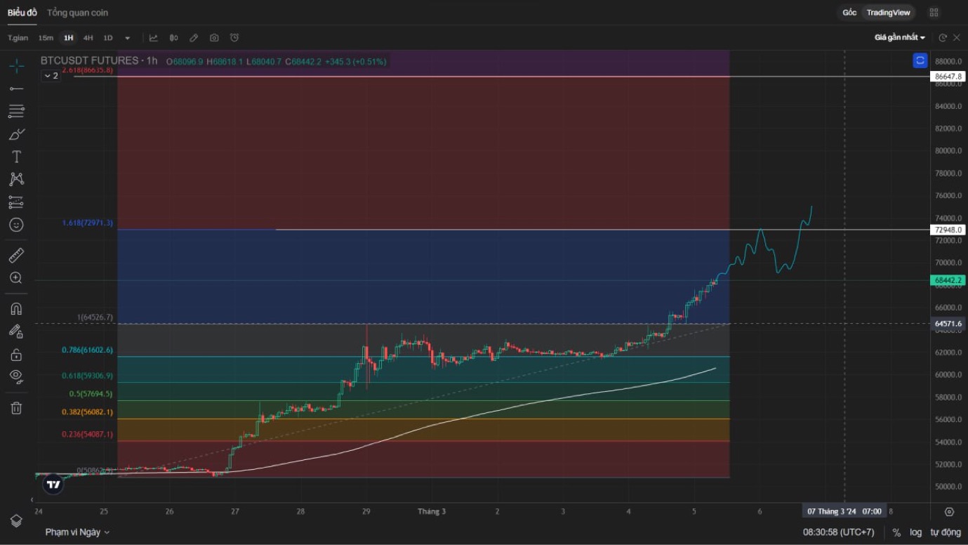 🔘Nhìn đúng ở cản thì đoạn này ít có cản, giống cách tụi nó đẩy #PEPE #SHIB, … Thường sẽ chạm và chỉnh khi tới các vùng Fibo lớn 1.618-2.618 ( ~ vùng giá 73-86k )