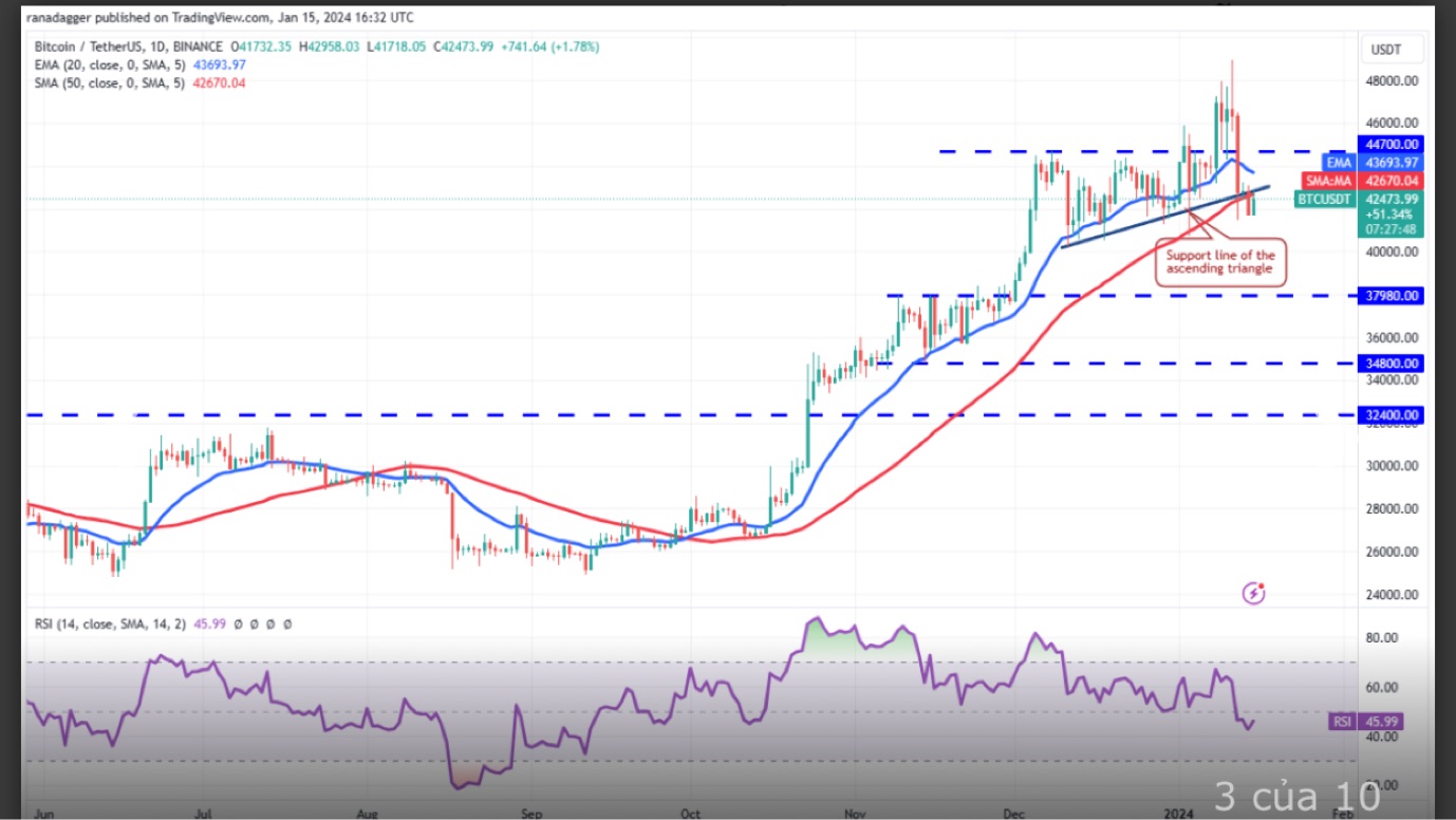 Đường EMA 20 ngày ($43.693) đã bắt đầu giảm và chỉ số RSI ở gần 46, cho thấy phe gấu đang có lợi thế hơn một chút.