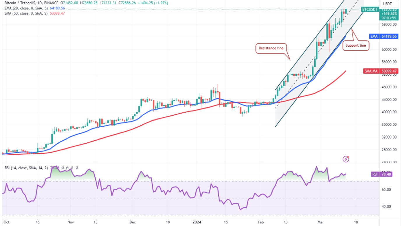 Phe gấu đã cố gắng bắt đầu một đợt pullback ở $73.000, nhưng phần đuôi dài trên thanh nến ngày 12 tháng 3 của Bitcoin cho thấy lực mua mạnh mẽ ở mức thấp hơn.