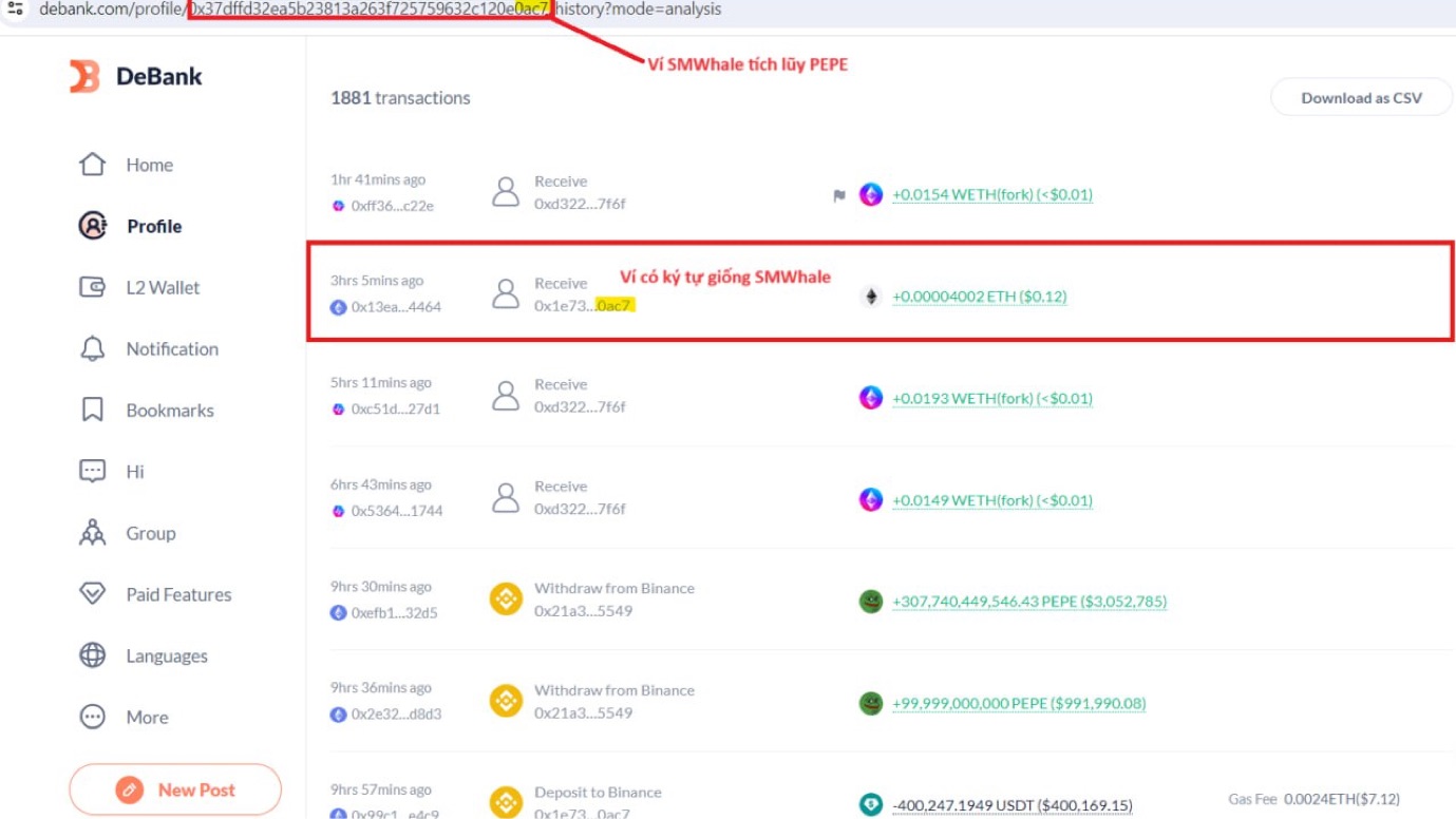 Sau khi SmartWhale rút khối lượng lớn $PEPE về ví một địa chỉ ví lạ có ký tự giống đã gửi 0,12 $ETH vào địa chỉ ví SmartWhale khả năng cao họ đang có ý định scam theo cách Whale chuyển nhầm 1155 $WBTC ($71M) cách đây vài ngày.