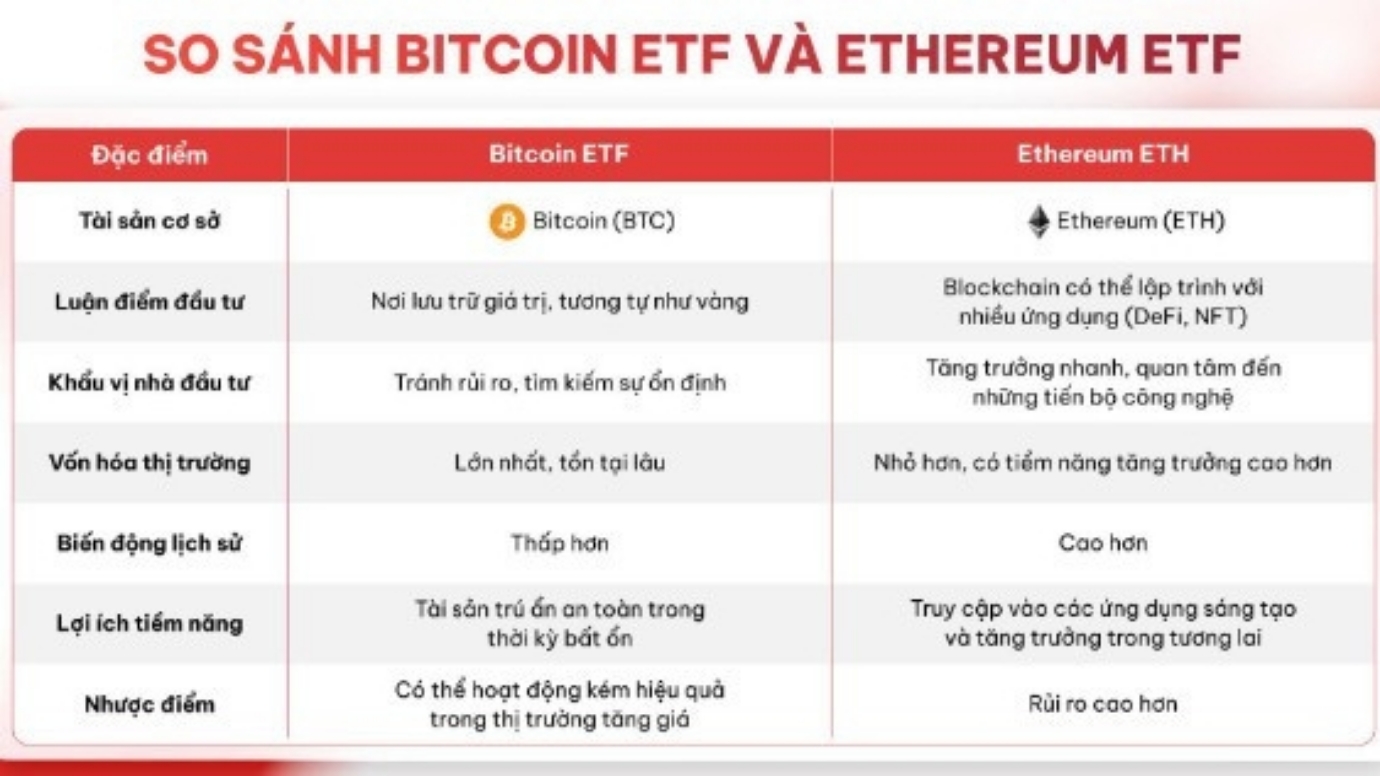 Bên cạnh đó, quyết định lựa chọn giữa 2 loại ETF phụ thuộc vào mục tiêu đầu tư và khả năng chấp nhận rủi ro cụ thể như triển vọng thị trường và khẩu vị rủi ro. Bitcoin hấp dẫn với vị thế “vàng kỹ thuật số,” trong khi Ethereum mang lại cơ hội tăng trưởng và lợi thế công nghệ, nhưng kèm theo rủi ro cao hơn.