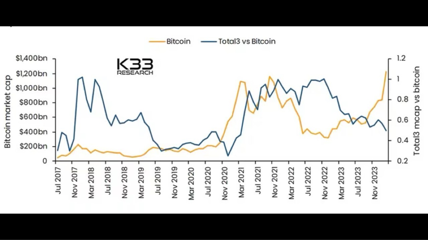 Báo cáo của K33 lưu ý rằng vốn hóa thị trường của BTC đã tăng gấp đôi so với tổng giá trị của tất cả các loại tiền điện tử ngoại trừ BTC và ETH, kể từ mức đáy thị trường vào tháng 11 năm 2022. Các nhà phân tích cho biết, set up này tương tự như thời điểm cuối năm 2020 trước khi các altcoin bắt đầu bắt kịp tốc độ của BTC.