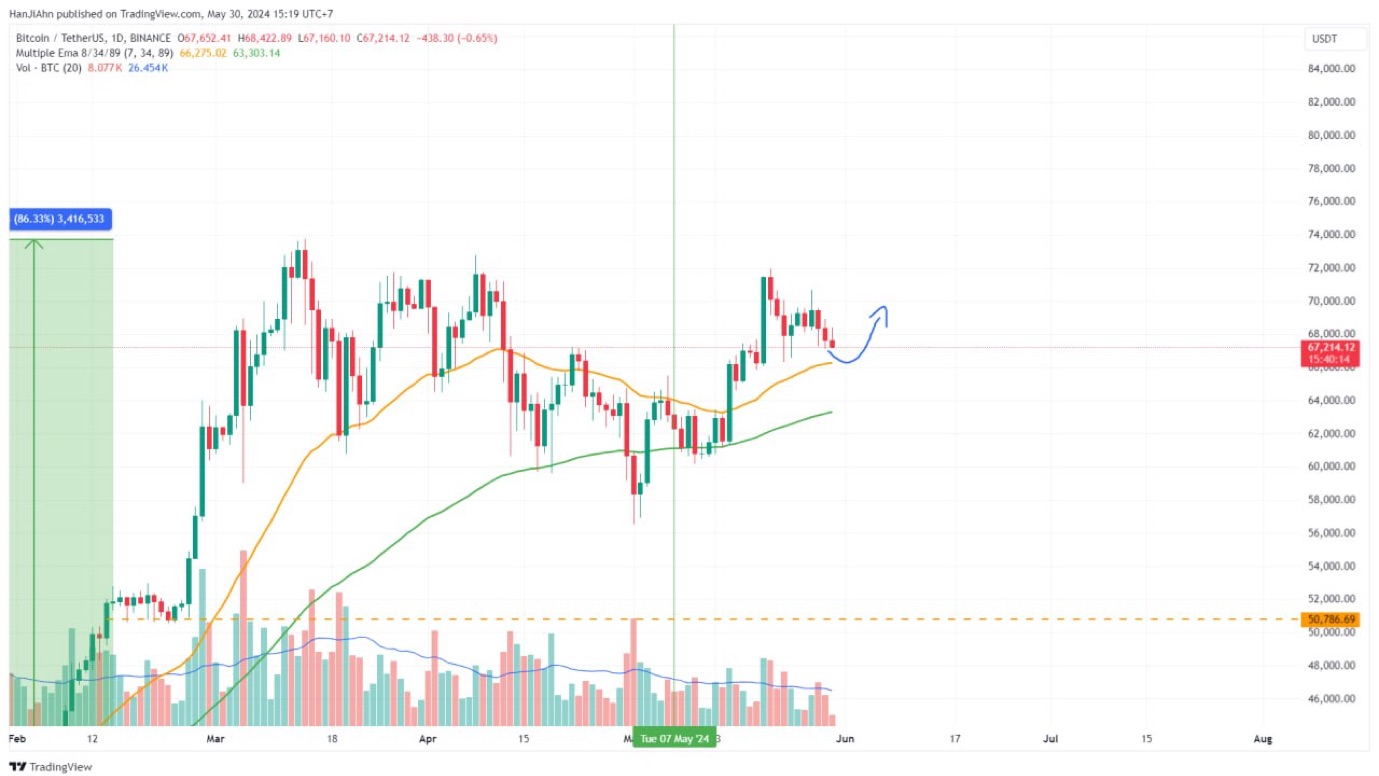 Thị trường có thể sẽ dừng điều chỉnh khi BTC về test lại EMA 34 1D và bắt đầu hồi phục lại. Trong giai đoạn BTC điều chỉnh giảm từ ngày 14/04-14/05, đã nhiều lần tiến lên chạm EMA 34 và bị từ chối giá, EMA 34 trở thành một kháng cự cứng, kháng cự cứng trong quá khứ sẽ trở thành hỗ trợ ở hiện tại.