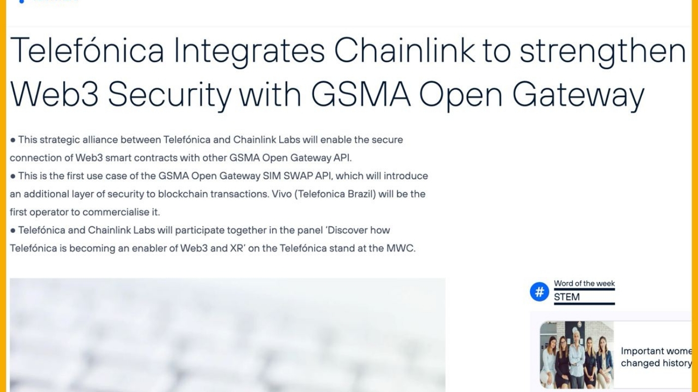 Công ty viễn thông Tây Ban Nha Telefonica đã thông báo về quan hệ đối tác với Chainlink để cung cấp các kết nối an toàn cho hợp đồng thông minh web3.