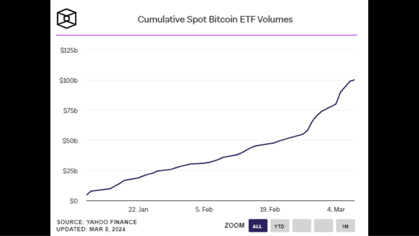 Việc vượt qua mốc 100 tỷ USD khối lượng giao dịch tích lũy của các quỹ ETF Bitcoin giao ngay diễn ra sau kết quả đặc biệt của ngày thứ 2 khi khối lượng giao dịch hàng ngày của các sản phẩm này gần đạt 10 tỷ USD.