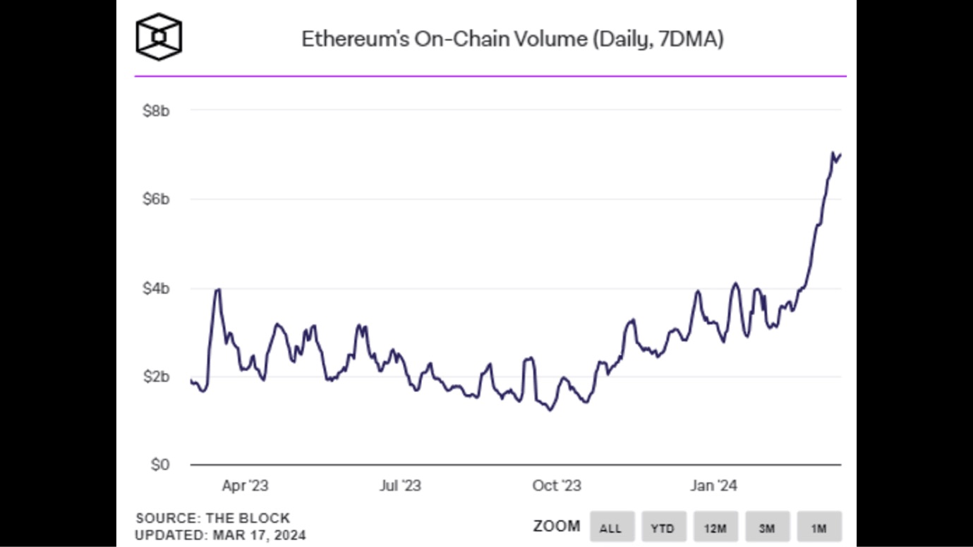🎯 Ngoài ra, khối lượng giao dịch on-chain của Ethereum đã tăng lên mức cao nhất trong năm. Cũng theo The Block, hơn 7 tỷ USD khối lượng giao dịch on-chain đã được ghi nhận vào hôm qua.