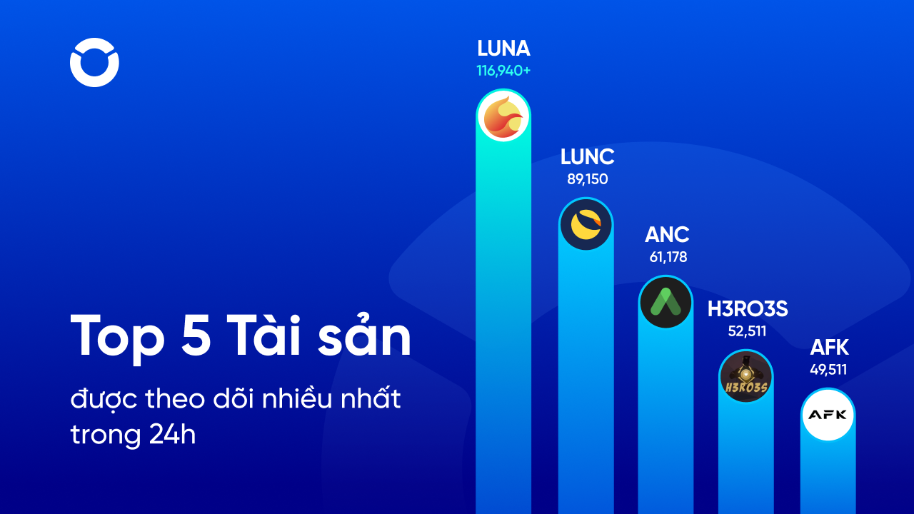 Chỉ trong 24h, LUNA đã thu hút gần 117 nghìn lượt quan tâm. LUNC theo sát với hơn 89 nghìn lượt bấm xem, tiếp đó là ANC, H3RO3S và AFK – những token liên tục được thảo luận sôi nổi trên các cộng đồng của ONUS.