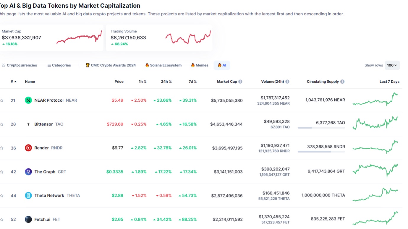 Theo CoinGecko, danh mục token AI trên nền tảng này đã tăng 25% trong 24 giờ qua.